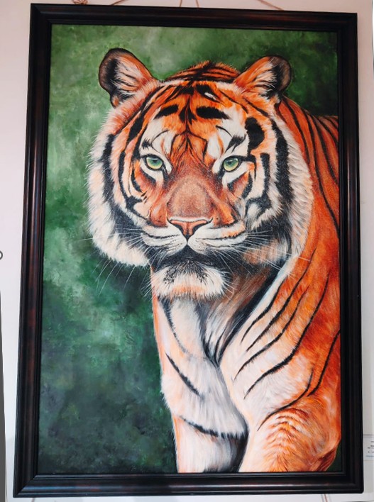 It is a powerful, realistic portrayal of a tiger with intense focus, set against a natural backdrop in earthy tones. The artist is known for wildlife art and uses oil and acrylic colour on canvas.